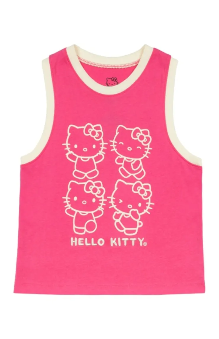 Hello Kitty adult cropped tank in the color pink featuring four adorable images of Hello Kitty on the front with "Hello Kitty" embroidered across the bottom.