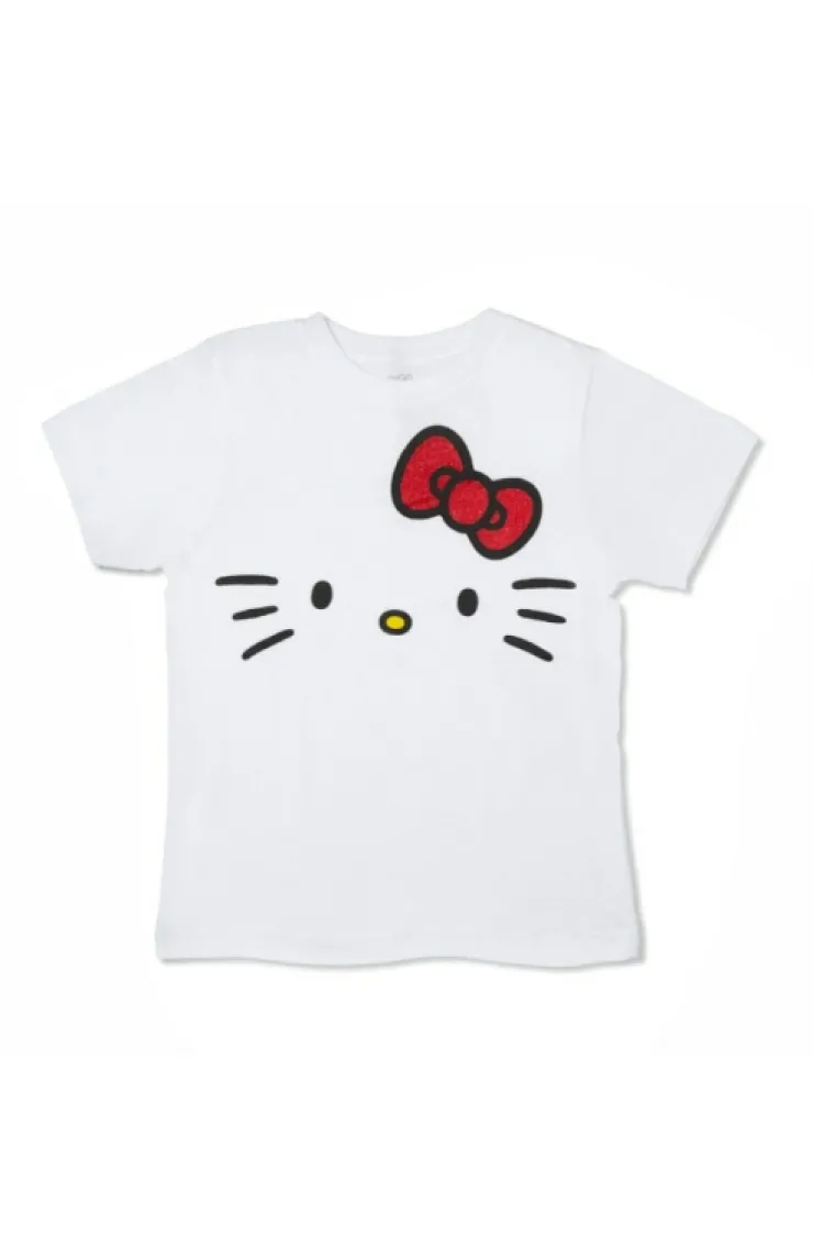 Adorable and fun youth t-shirt featuring Hello Kitty, screen printed with a shimmering finish on light & comfy, white garment.