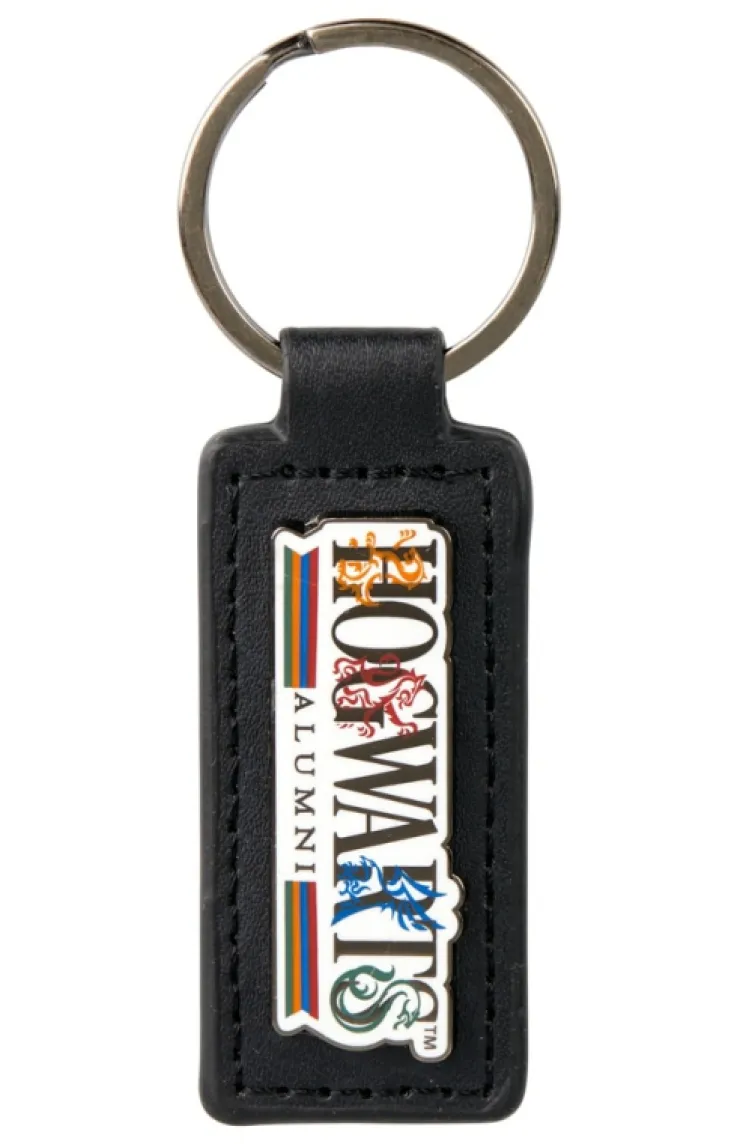 Represent school pride with this Hogwarts Alumni faux leather keychain featuring the Hogwarts Alumni logo adorned with house colors and icons.