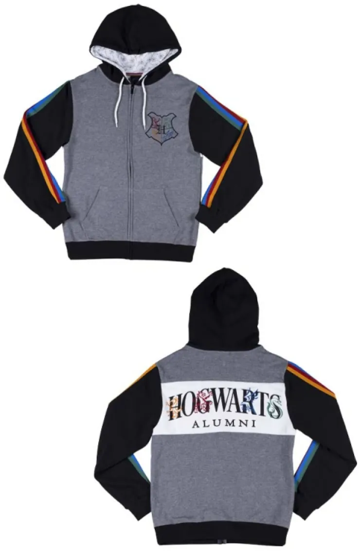 Comfortable, zip-up hooded sweatshirt featuring a stylized Hogwarts crest on the front left chest, and "Hogwarts Alumni" across the back. Design is accented by the four Hogwarts house colors striped vertically along each sleeve, and is screen printed on soft, color blocked grey & black garment with a Hogwarts crest patterned hood interior.