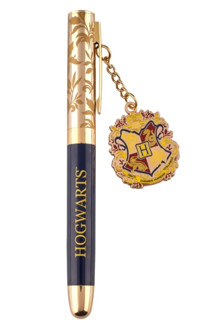 Black ink, ball point pen with "Hogwarts" printed on a navy-blue base and a gold-tone dangling Hogwarts crest charm. Pen has a removable cap that has a clip for secure storage.