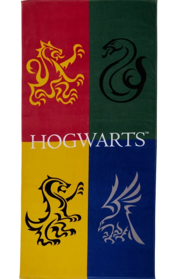 Represent school pride with this Hogwarts beach towel. Color-block design features the four Hogwarts houses accented by house colors and emblems printed on soft, cotton towel.