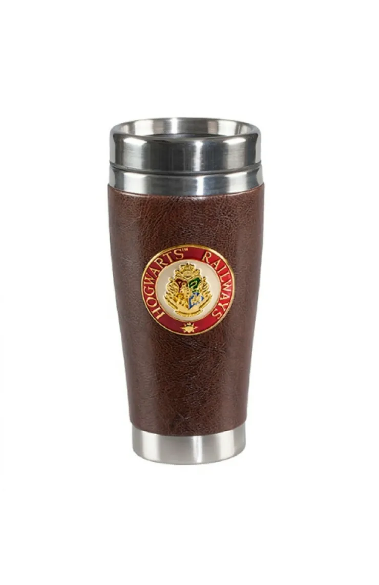 Stainless steel tumbler featuring a Hogwarts Railways metal medallion on faux leather wrap from The Wizarding World of Harry Potter™