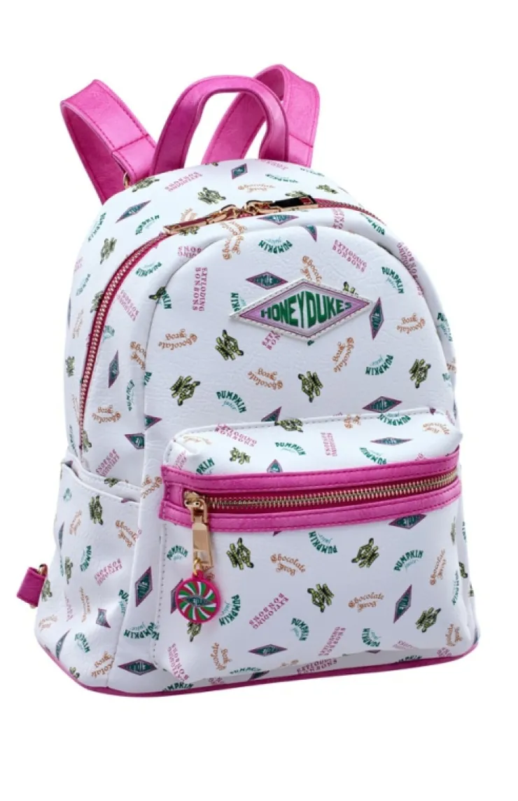 Carry all of your Honeydukes treats in this Honeydukes themed mini backpack. Bag features one main zippered compartment with an additional interior zippered compartment and a smaller exterior compartment to separate your treats. The adjustable straps ensure your bag stays secure during your adventures.