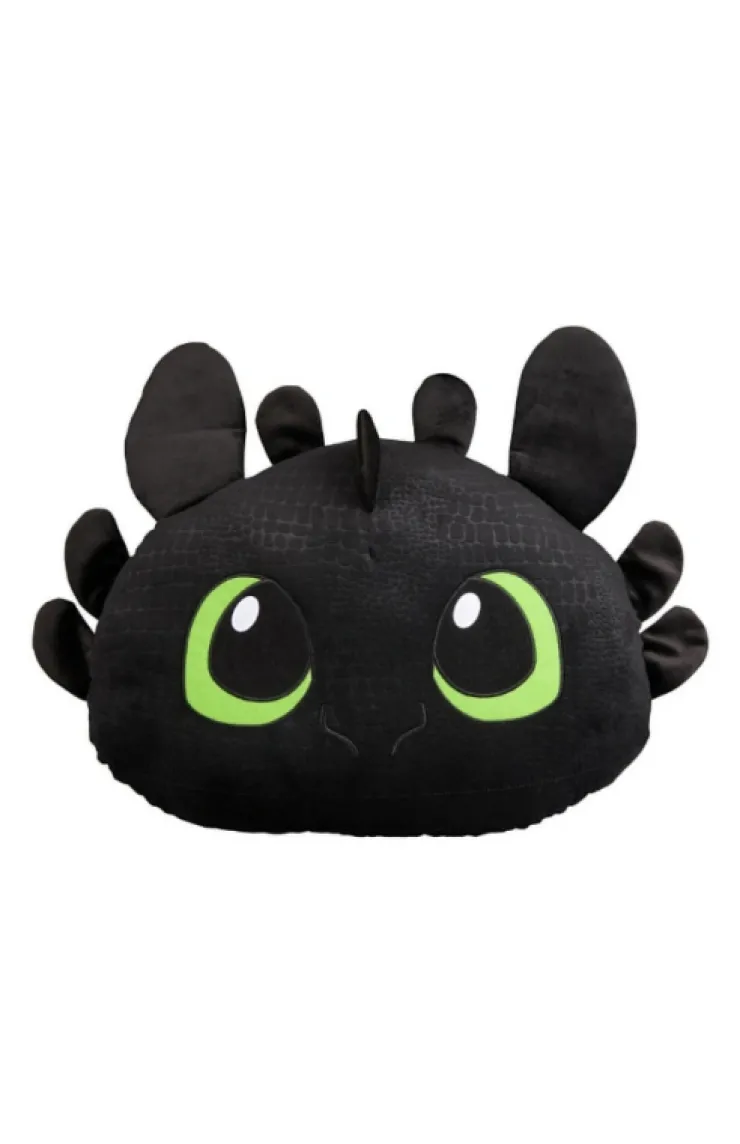 Super soft, plush pillow of Toothless featuring vibrant, appliquéd green eyes, scales patterned throughout design, and "DragonsÂ" embroidered across the back. It’s the perfect pillow to lean against when you’re reading up on How to Train Your Dragon.