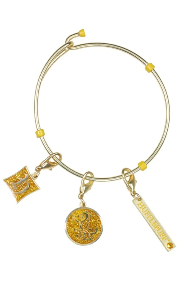 Elegant gold-tone Hufflepuff bracelet with hook closure and three removable charms.