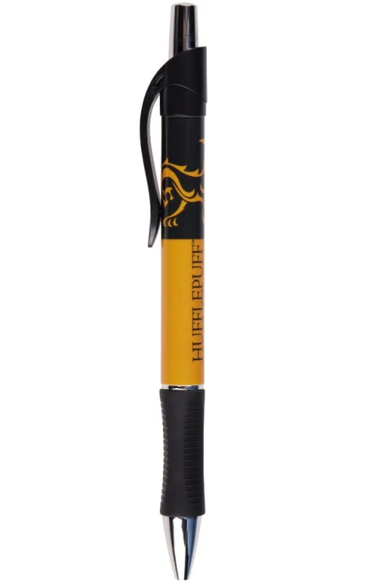 Record your notes with this Hufflepuff ballpoint pen featuring house colors, name, and badger emblem. Retractable click pen with a comfort grip writes in black ink and has a clip for securely storing it where you need to.
