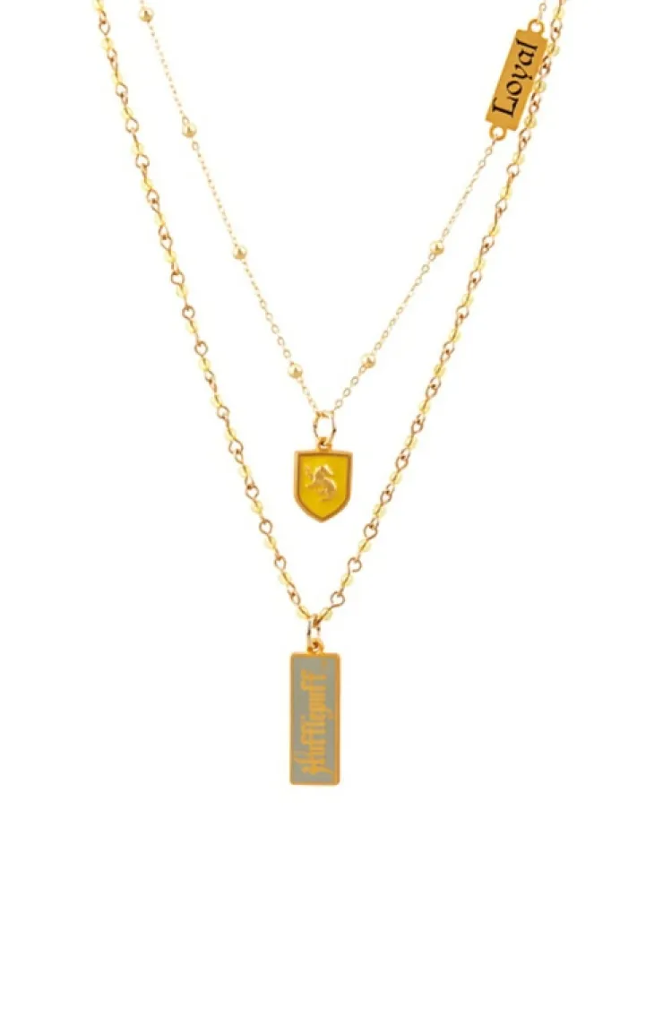 Beautiful, tiered necklace featuring charms of the Hufflepuff house shield and "Loyal" on a beaded, gold-tone chain. Second tier features a Hufflepuff pendant, and is complemented by colorful accent beads spaced along a lightweight, gold-tone chain.
