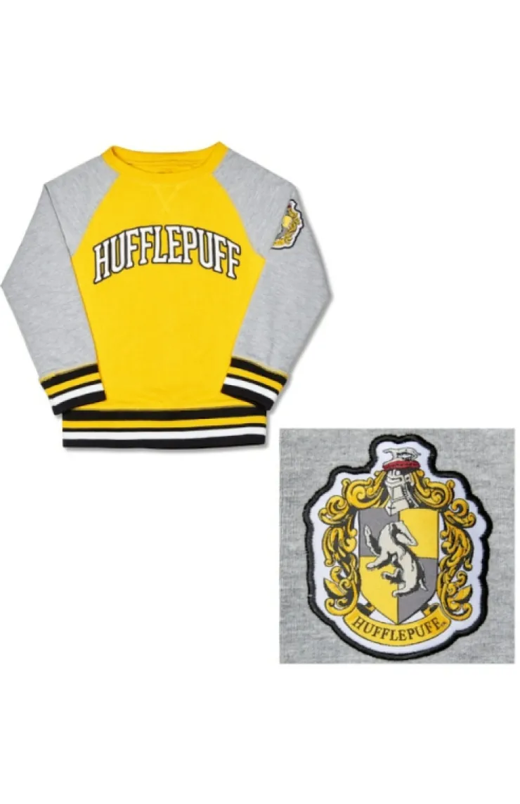Hufflepuff crew neck youth sweatshirt with house name appliquéd on color-blocked body, and woven house crest on left sleeve from The Wizarding World of Harry Potter™. Comfortable, tri-tone sweatshirt with raglan sleeves features house colors striped along ribbed cuffs and waistband for an additional fashion touch.