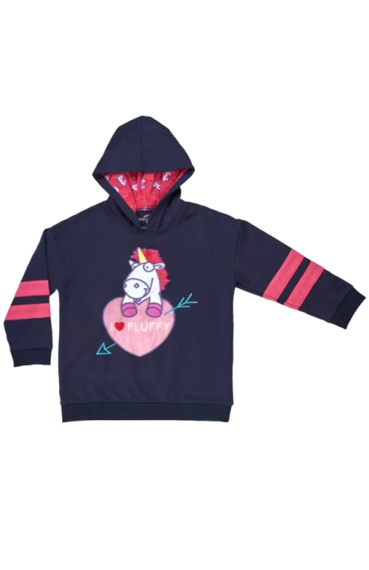 Adorable pullover youth sweatshirt with hood featuring Fluffy the Unicorn and "I ❤ Fluffy". Design is appliqued on the front of comfy, navy blue garment with a Unicorn patterned hood interior and pink stripe accents on each sleeve.