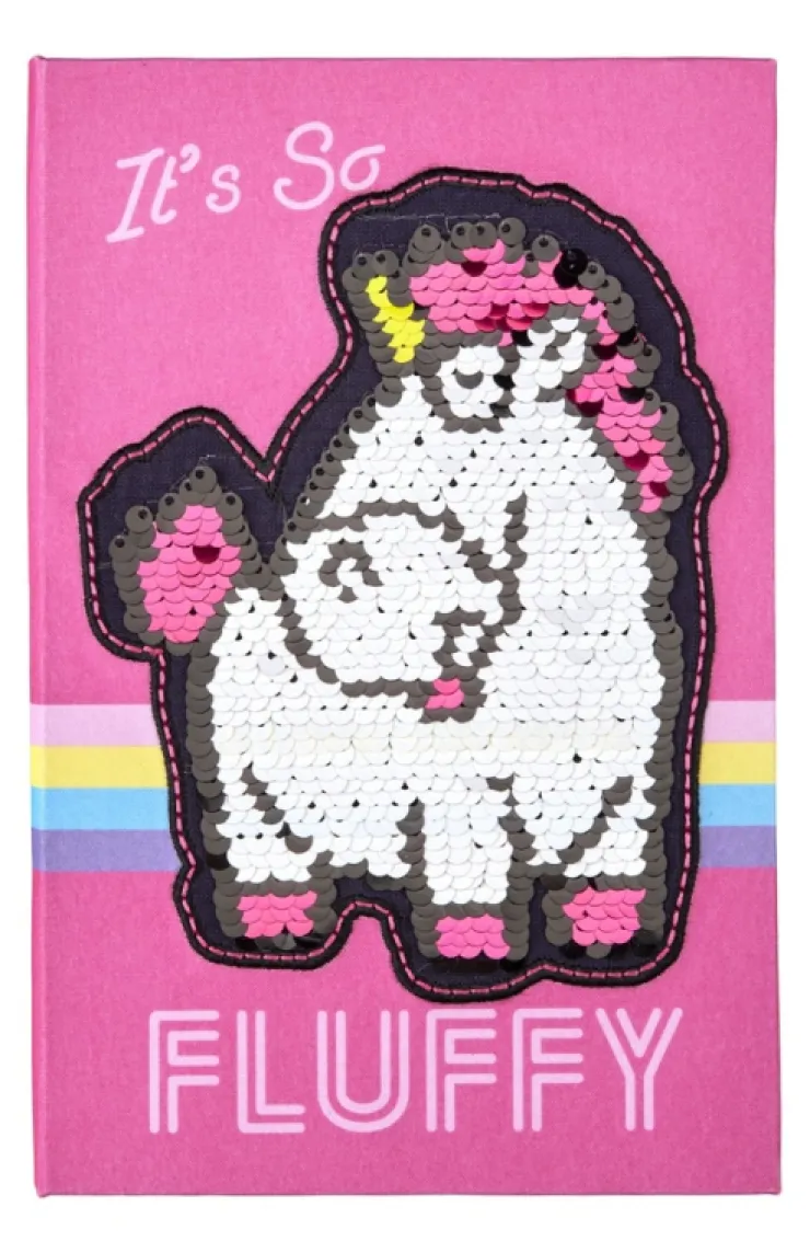 It's So Fluffy! This adorable canvas-covered Fluffy the Unicorn flip sequin journal is perfect for recording your thoughts. The journal consists of 120 pink, yellow, and blue lined pages with fun Fluffy the Unicorn images on each page.