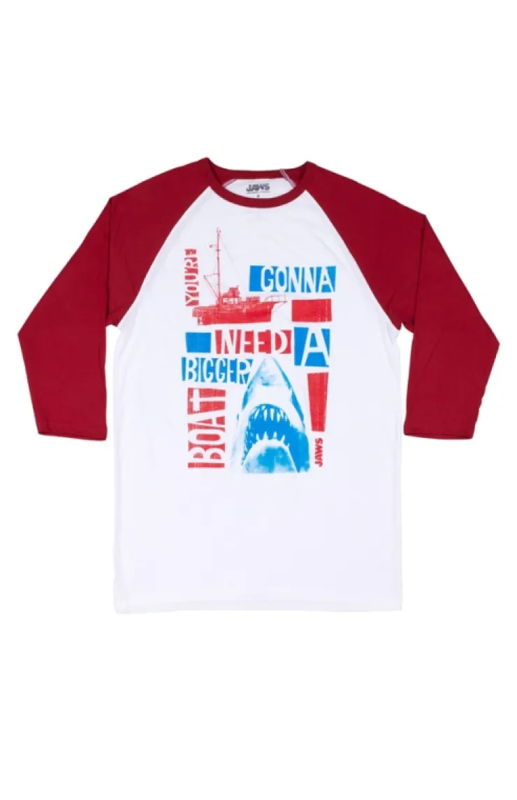 Commemorate your favorite line from the iconic cinematic thriller, JAWS, with this adult raglan t-shirt. Vibrant design features "You're Gonna Need a Bigger Boat!" block printed with classic image of Jaws coming for The Orca on a comfy, white garment with red neckline and sleeves.