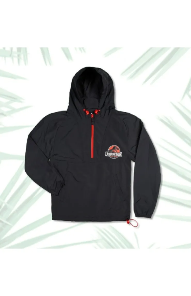 The iconic Jurassic Park logo from the film that started it all on pull-over hooded windbreaker jacket with quarter zip-up, front-angled pockets, and adjustable waistband. Color screen print and red zipper stand out against solid black garment.