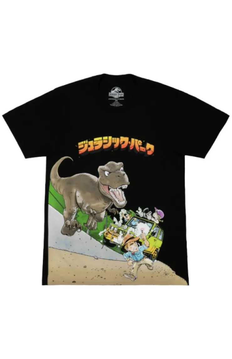Jurassic Park adult black t-shirt featuring some of your favorite characters in a cartoon anime style design.