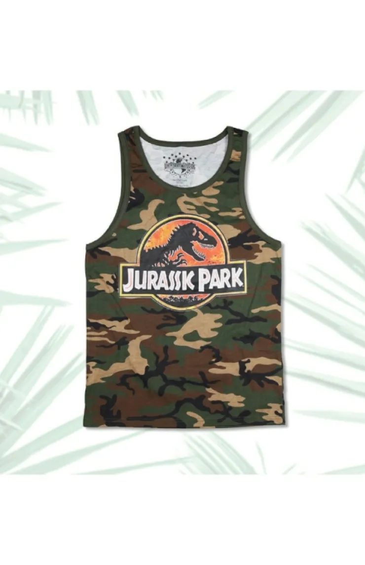 Dress for adventure with this Jurassic Park camouflage tank top. Design features screen printed classic logo on light and comfy shirt body.