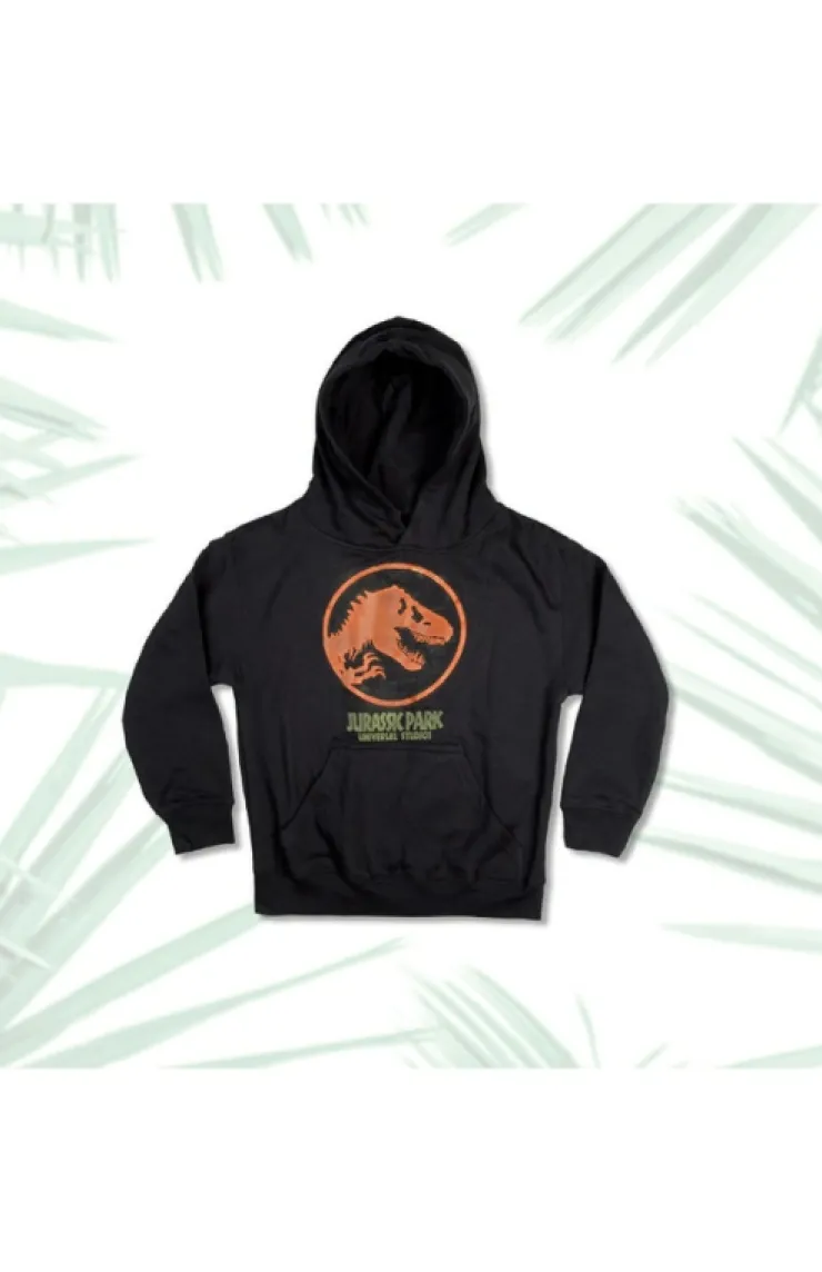 The iconic Jurassic Park logo from the film that started it all on a pull-over hooded sweatshirt with front hand-warmer pocket. Color screen print with faux-leather treatment stands out against solid black garment.
