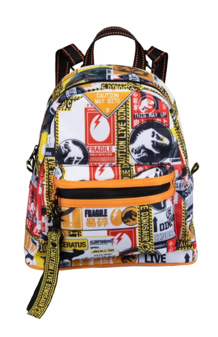 Caution: Live Dinosaurs! Jurassic World adventurers will love this dinosaur shipping label patterned mini backpack. Design features durable straps, two main compartments, and one hidden pocket kept secure with zipper closures.