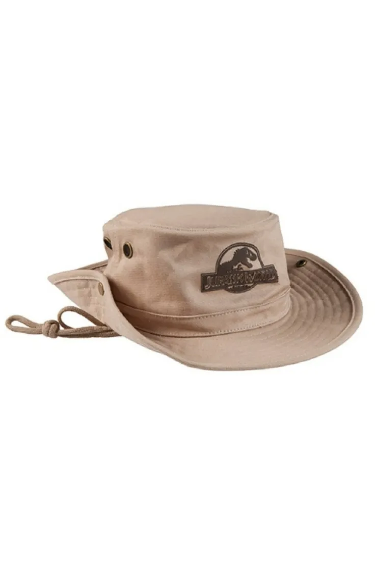 The Jurassic World logo outlined in brown tops this handsome canvas safari hat fashioned for exploration and dino expeditions.