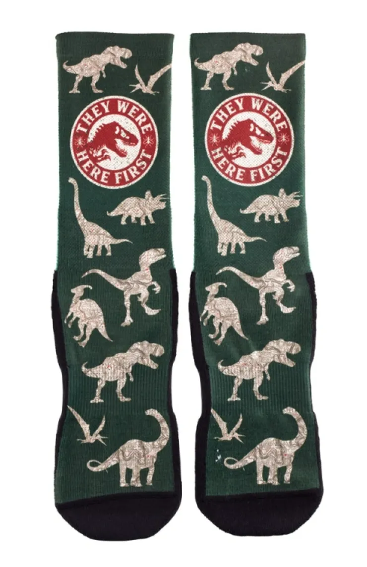 Comfy, Jurassic World knit adult socks featuring "They Were Here First" and various dinosaurs patterned throughout.