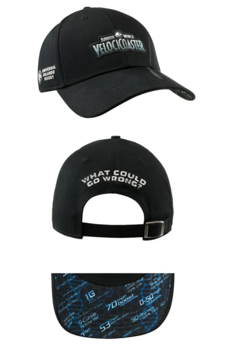 Get ready for a new species of roller coaster! Commemorate our fiercest new attraction with this adult cap featuring the Jurassic World VelociCoaster. Design has appliqué Jurassic World VelociCoaster logo on front, claw marks across the front panel & bill, sublimated underbill featuring descriptions of the coaster, Universal Orlando Resort logo on the right side panel, and "What Could Go Wrong?" embroidered above an adjustable buckle strap closure.