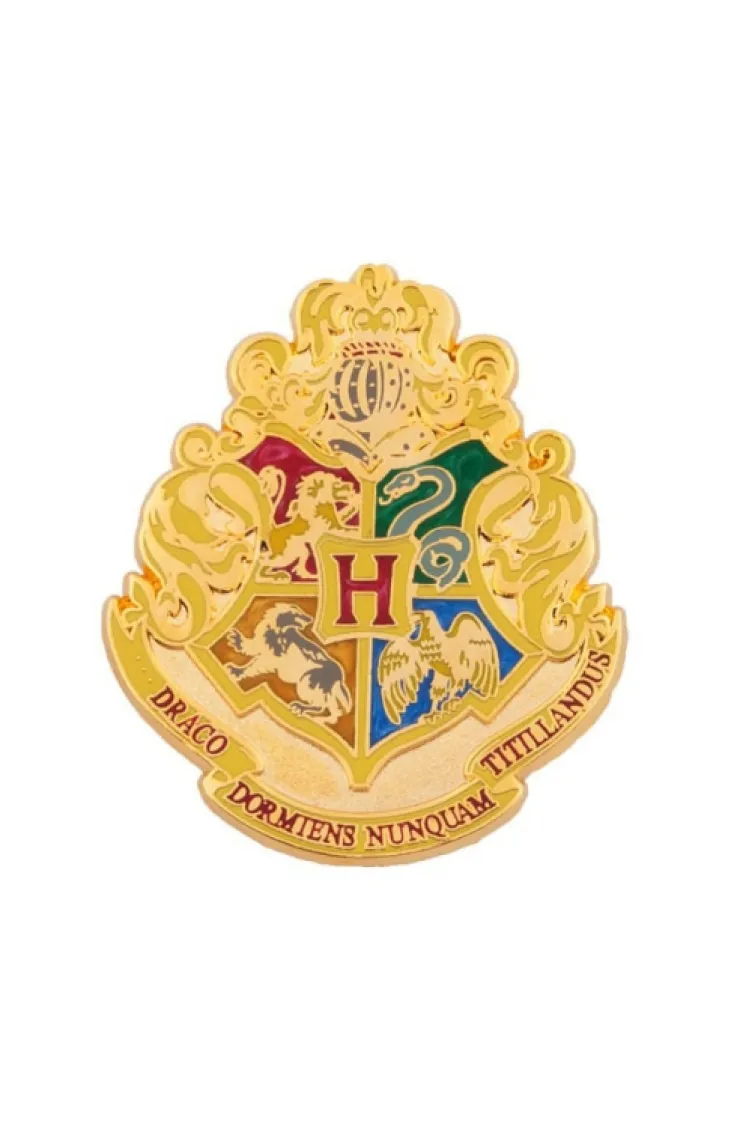 The Hogwarts crest features in this multicolored, hard enamel fill pin with a gold-plated finish and sandblasted detail. Measures approximately 2 x 2 1/4 inches.