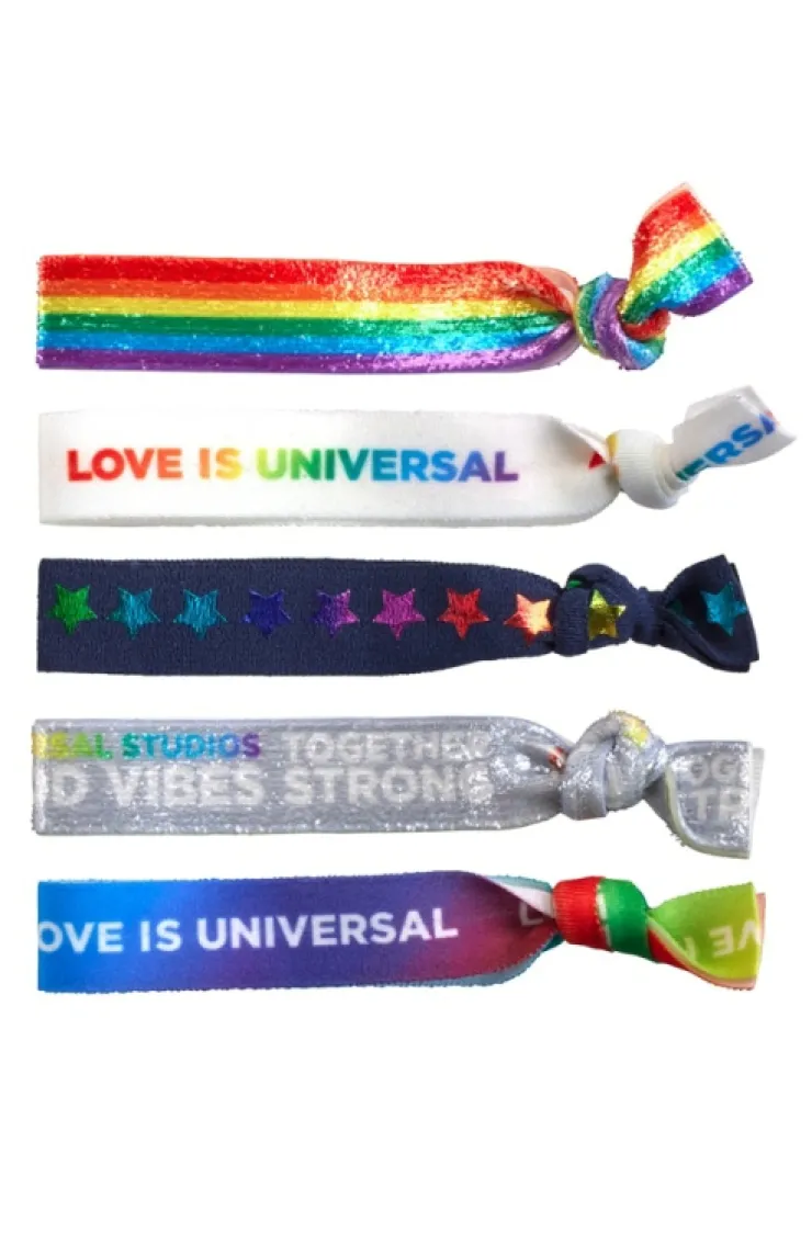 Show your support with these stretchy ribbon hair ties, featuring assorted "Love is Universal" designs.
