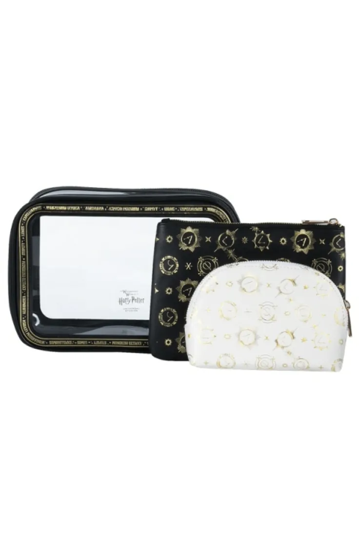 Three piece zippered cosmetic bag set featuring a transparent large bag that holds a medium black bag and small cream-colored bag. All bags covered in various spells printed in a gold-tone foil. Ideal for all witches and wizards on the go.
