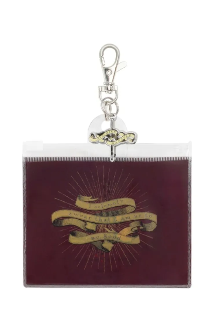 Marauder's Map re-sealable lanyard pouch featuring "I Solemnly Swear That I Am Up To No Good" across the front. Includes dangling "Mischief Managed" charm.