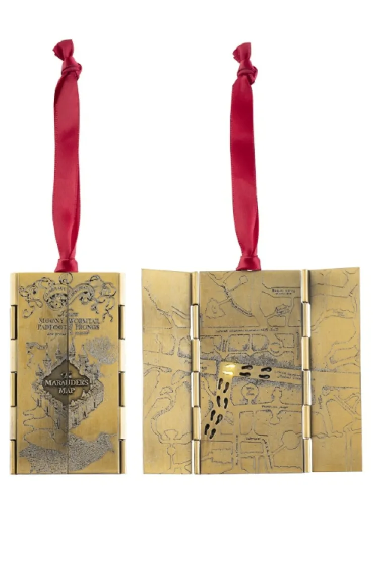 Mischief managed! Add a touch of magic to your holiday tree with this Marauder's Map light-up ornament. Hinged design opens to reveal the corridors of Hogwarts™ and footprints that illuminate as they walk throughout. Light-up feature is button activated.