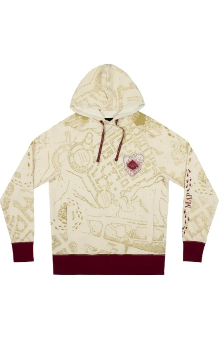 Marauder's Map adult hooded pullover adult fleece in the color cream featuring an allover print of the iconic Marauder's Map.