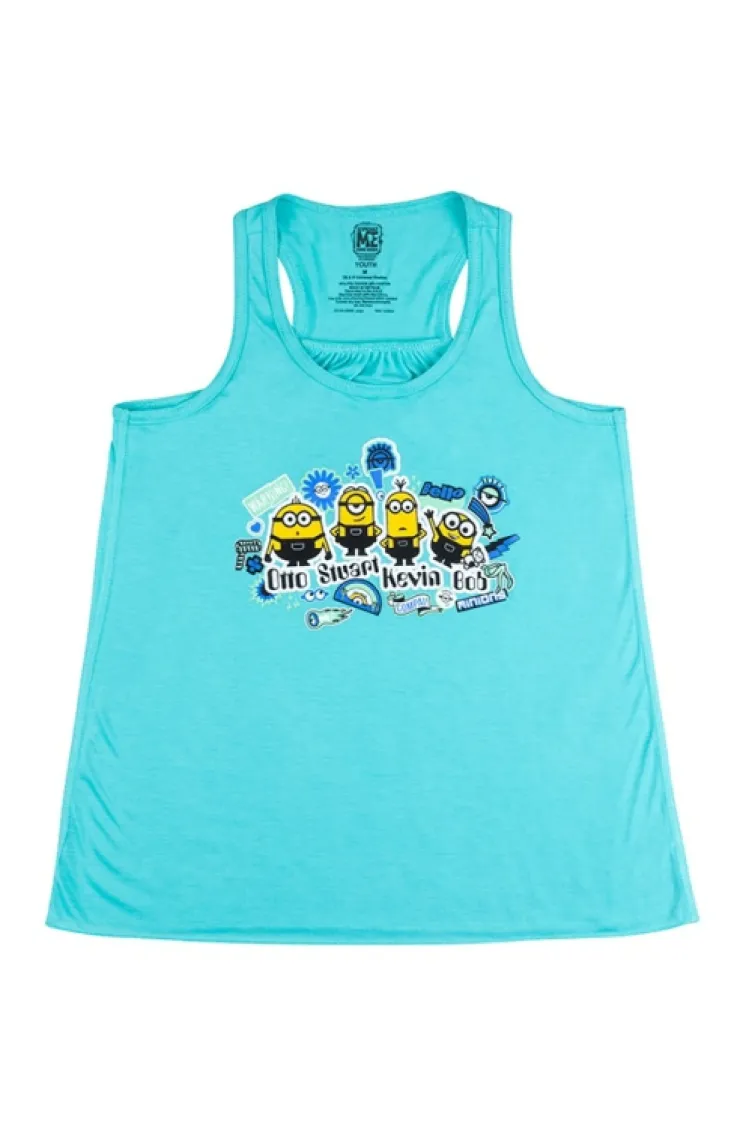 Looking to stir some mayhem? Join Otto, Stuart, Kevin, and Bob with this youth girls tank. Adorable minion design is screen printed on soft, mint colored garment.