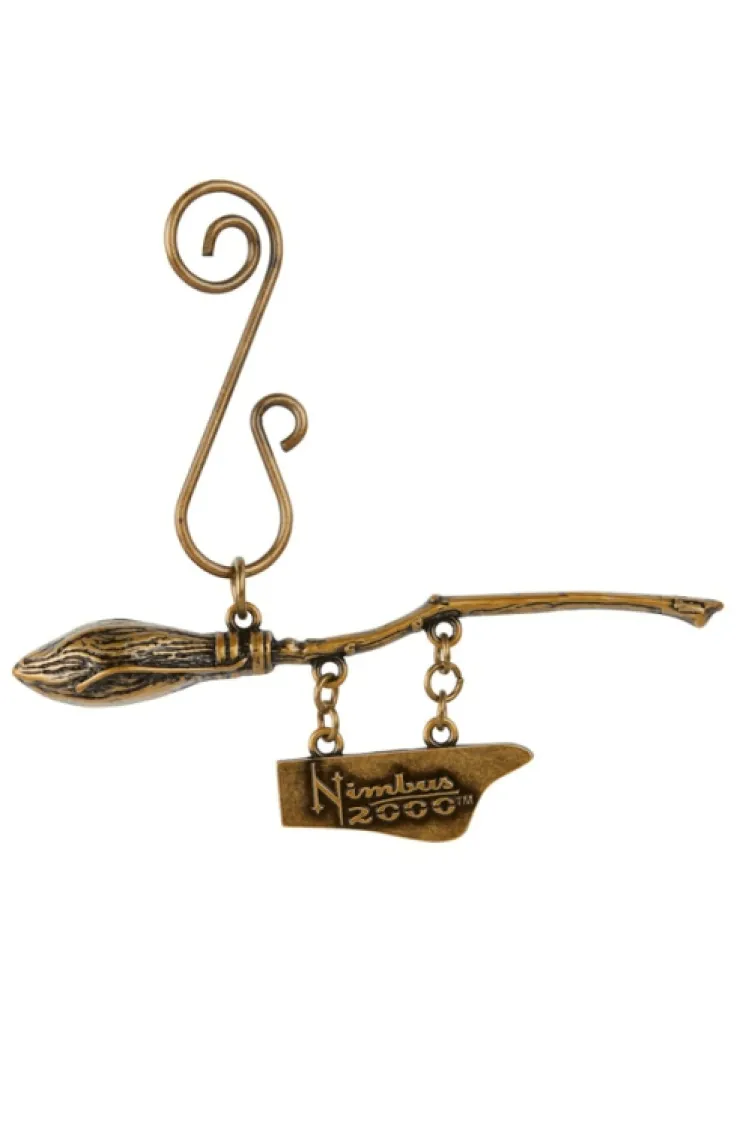 Detailed ornament featuring a Nimbus 2000 broom on sculpted, gold-tone brushed metal with a molded charm and spiral ornament hook for hanging.
