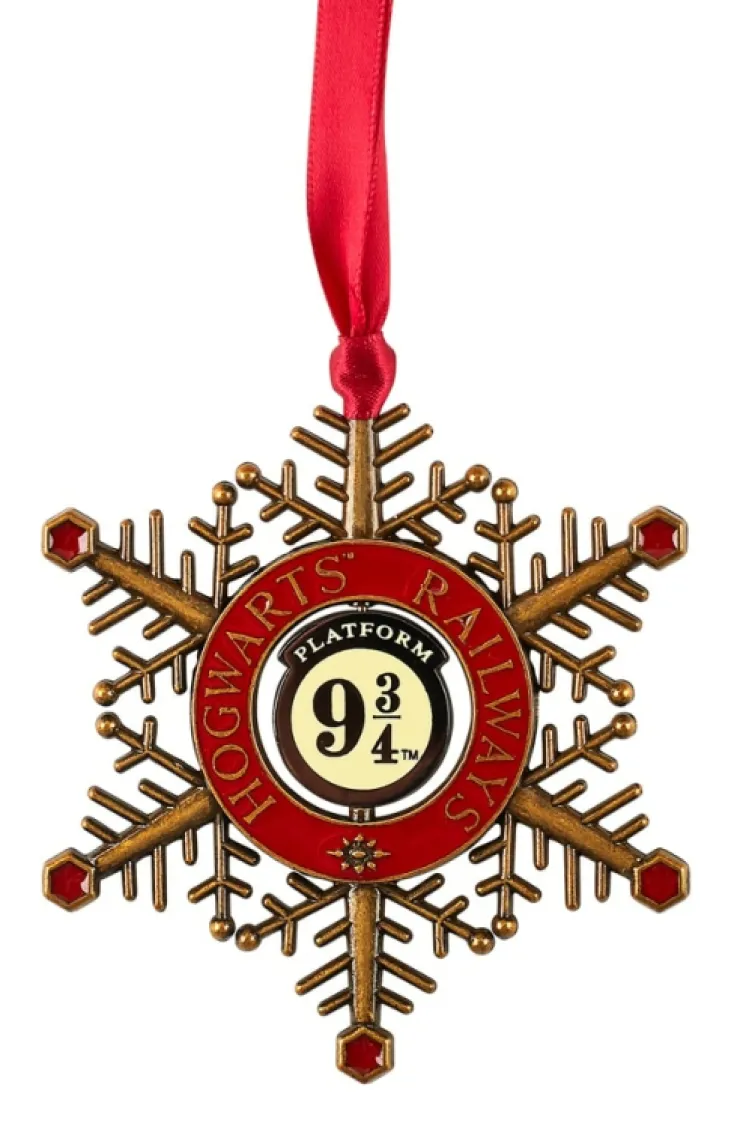 Beautiful spinner ornament featuring Platform 9 3/4 and Hogwarts™ Railways in the center of a brushed metal snow flake accented by a scarlet ribbon for hanging.