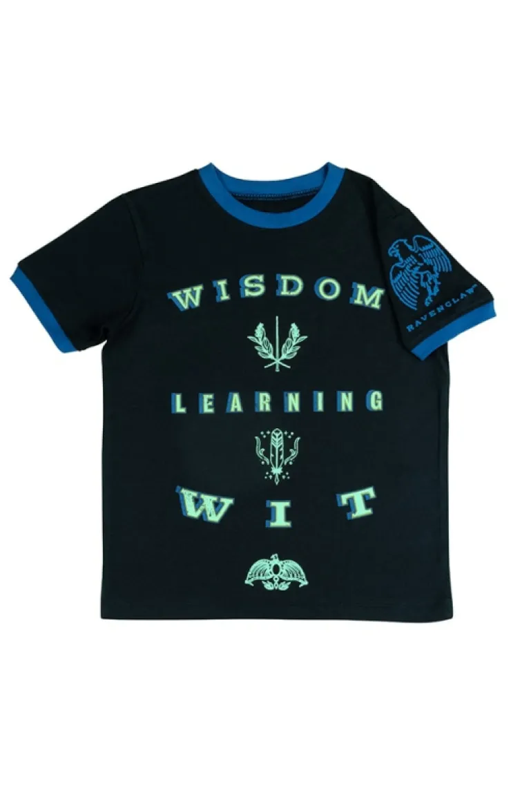 A solid black youth t-shirt with blue trim along the neckline and sleeves that describes the attributes of a Ravenclaw – Wisdom, Learning, and Wit – screen printed on the front in blue and white. Design also features the house icon and Ravenclaw on the left sleeve.