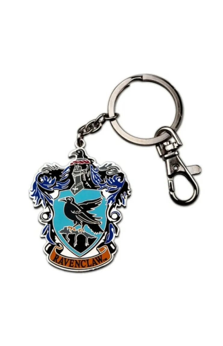 This keychain has multicolored, hard-enamel fill in Ravenclaw colors with a brushed, gold-plated finish. Crest measures approximately 2 x 2 ¼ inches.