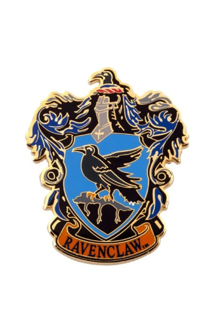 This pin is multicolored, hard enamel fill featuring Ravenclaw house colors and a gold-plated finish. Measures approximately 1 1/2 x 2 inches.