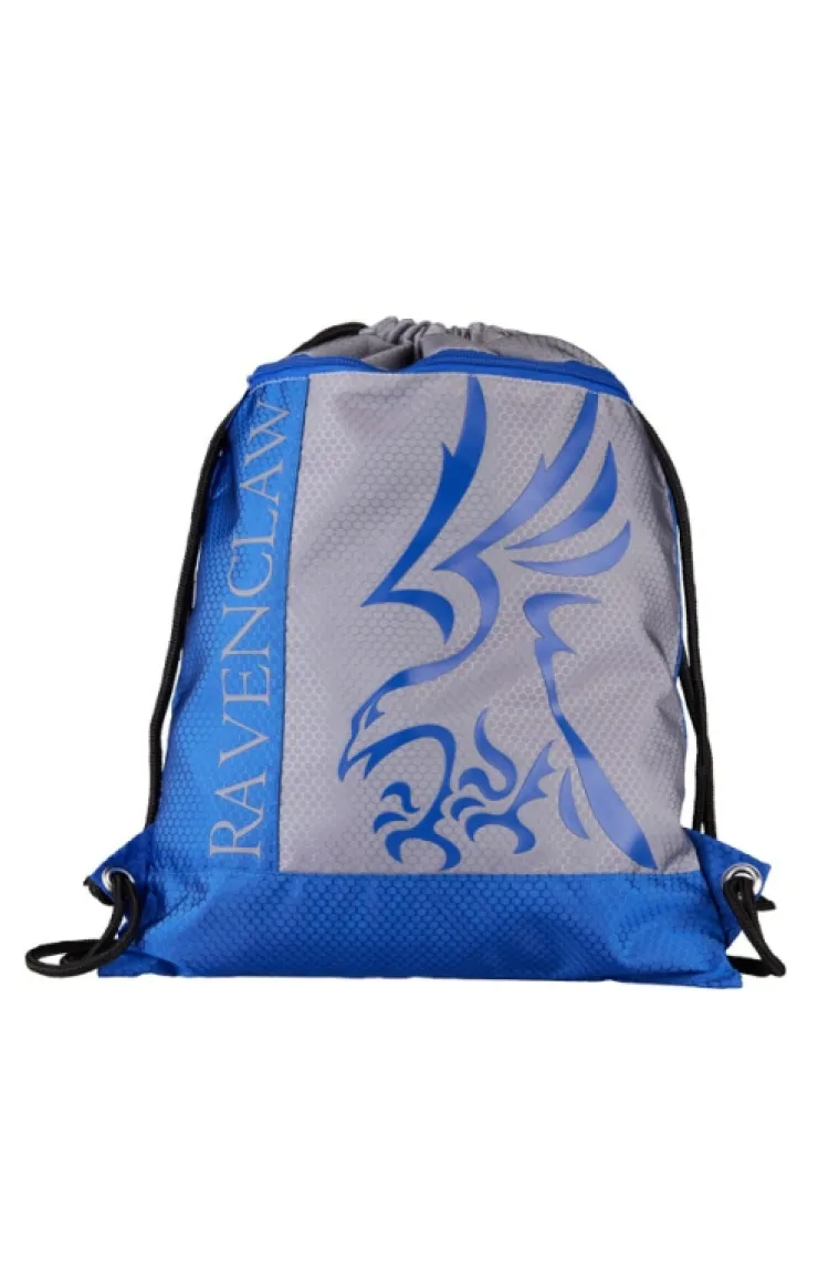 Ravenclaw drawstring backpack with house mascot, colors, and name proudly displayed on front. Design is featured on lightweight, durable polyester material with a honeycomb stitched pattern, zippered front pocket, and black drawstrings.