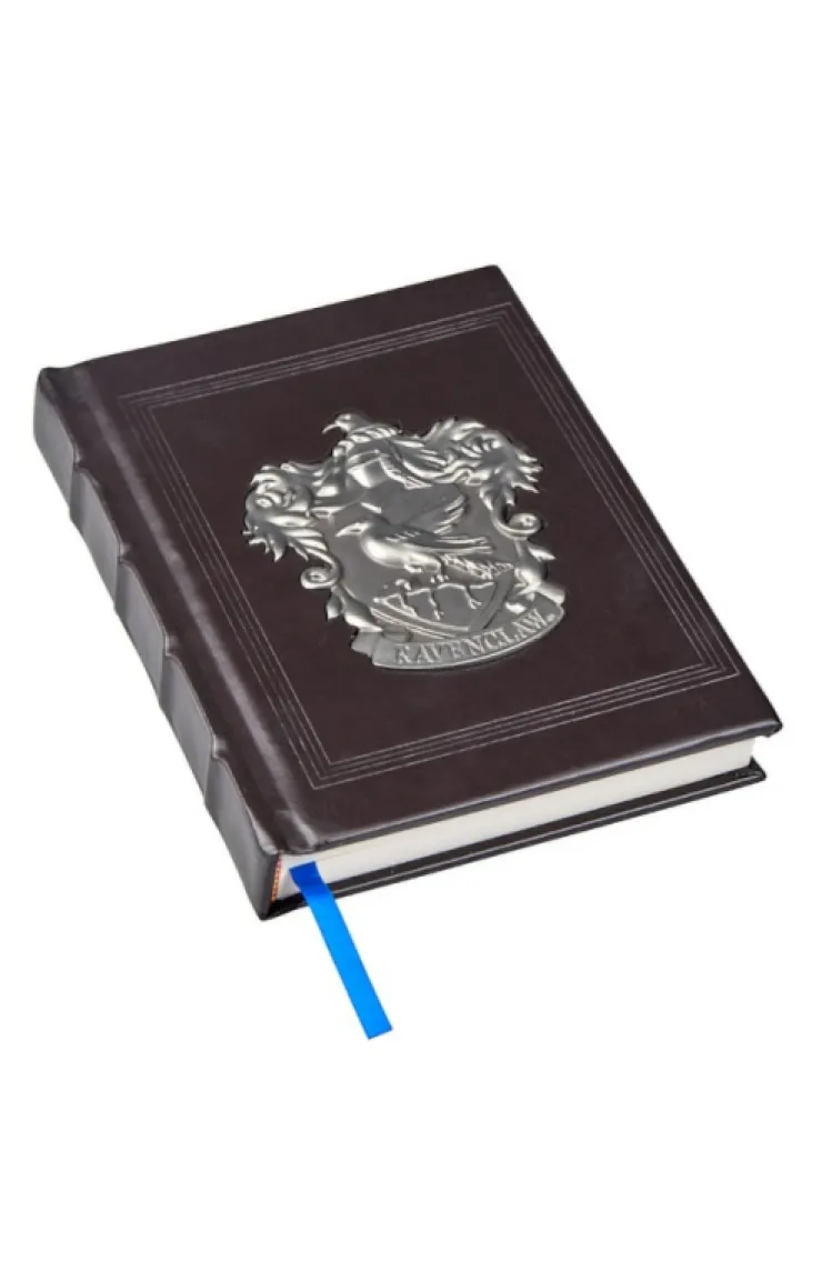 This journal features a silver metal Ravenclaw crest on a black faux-leather cover. A blue ribbon marks your place within the cream colored pages.