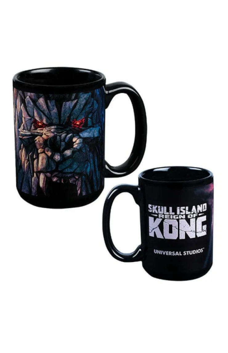 Think twice before drinking from this mug depicting a Kong rock face with burning red eyes in sublimated art on glossy black mug body.