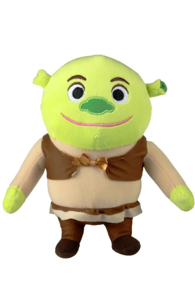 This adorable cutie plush of Shrek is ready for adventure! Design is accented by a brown satin ribbon, vest, and embroidered detailing.
