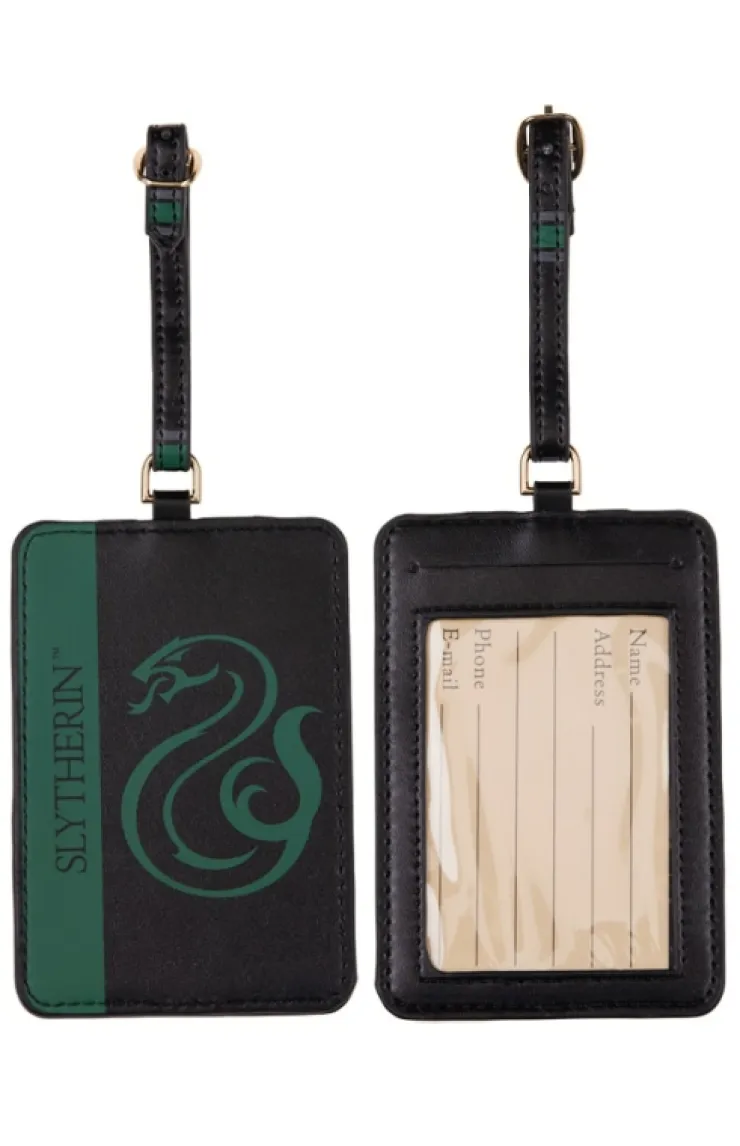 Slytherin luggage tag with house colors and emblem printed on the front. Tag features an adjustable buckle strap and cut out window with a printed address card on the reverse side.