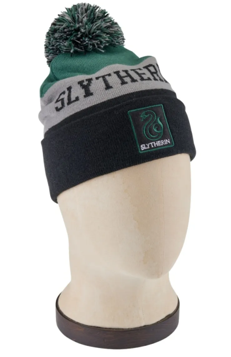 Slytherin knit beanie in house colors with embroidered emblem over front trim, accented by pom embellishment on top.