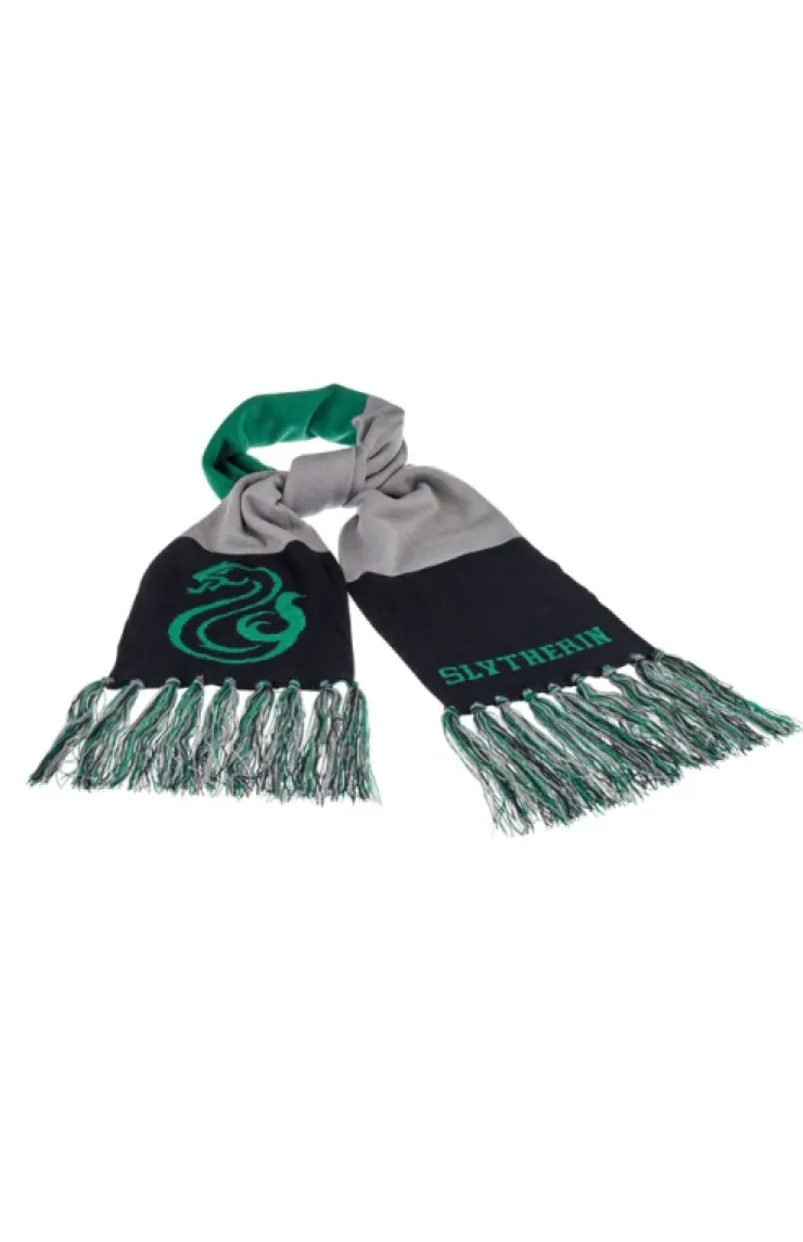 This comfy and stylish knit Slytherin scarf in house colors features a woven emblem design with fringe trim.