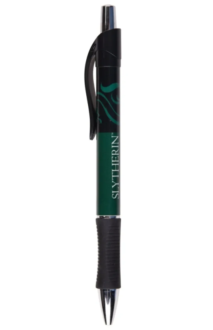 Record your notes with this Slytherin ballpoint pen featuring house colors, name, and serpent emblem. Retractable click pen with a comfort grip writes in black ink and has a clip for securely storing it where you need to.
