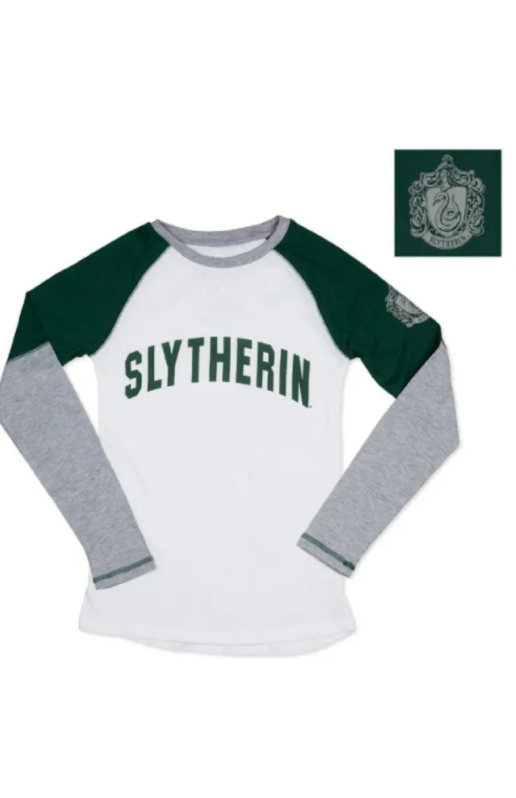 Long-sleeved color blocked raglan t-shirt featuring Slytherin screen printed on front of comfortable, tri-tone shirt body with house crest print on left sleeve from The Wizarding World of Harry Potter™.