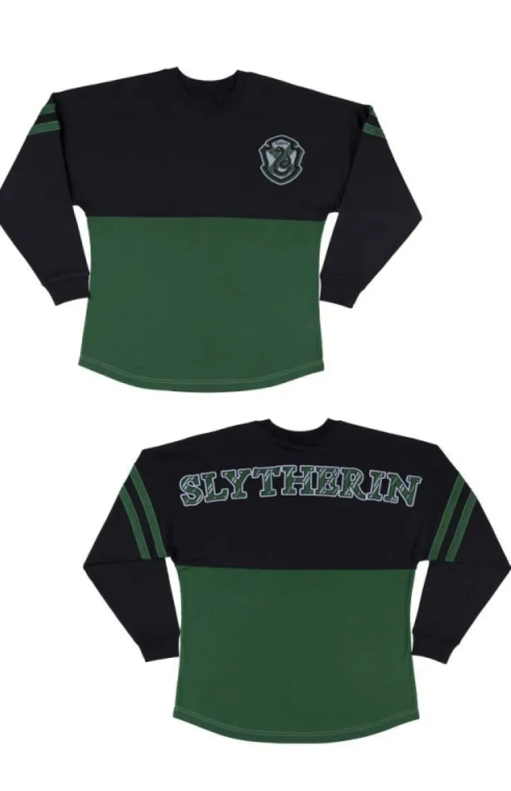 Comfortable ladies long-sleeve t-shirt featuring the Slytherin house crest on the front left chest, and house name appliquéd across the back. Design is featured on color blocked, green & black garment with striped long-sleeves and a rounded hem.