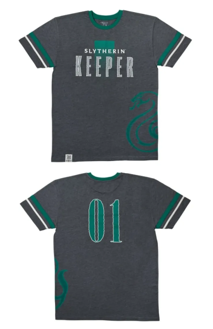 Slytherin Quidditch Keeper adult t-shirt featuring the house emblem on front and "01", the number worn by this position responsible for protecting the Quidditch hoops from goal-scoring Chasers, on back. Design is screen printed on comfy charcoal grey garment, and is accented by Slytherin's house color along the neckline and sleeves.