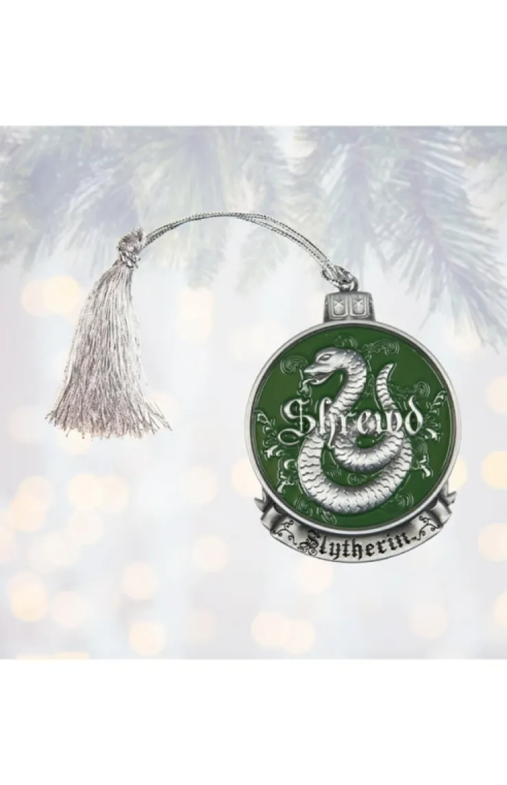 Ornament from The Wizarding World of Harry Potter™ that describes the attributes of a Slytherin. Sculpted design is enamel filled on antique style silver-tone metal, complimented by a silver-colored tassel for hanging.