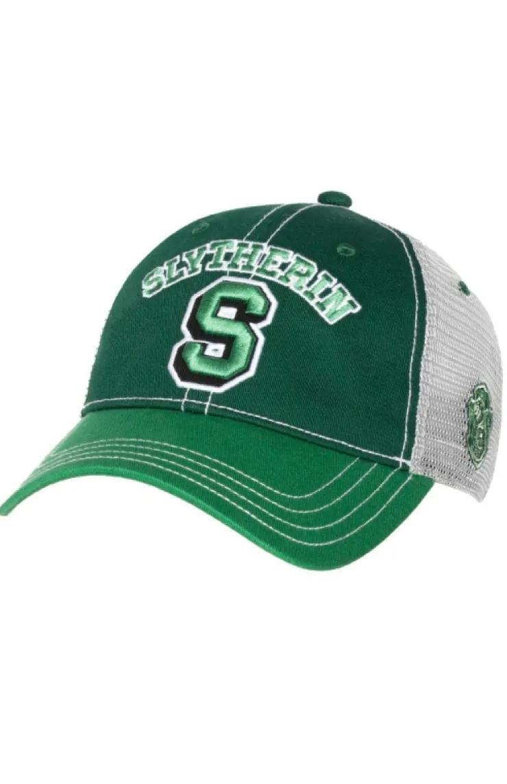 Six-panel Slytherin Quidditch™ Team Captain cap with contrasting stitching and mesh backing. Adult cap features an embroidered patch of the house icon on the side and "Team Captain" on the back.