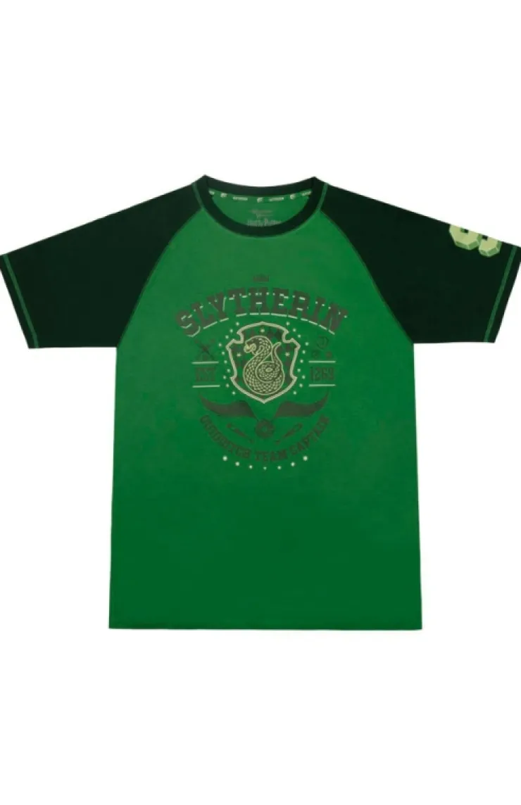 Slytherin Quidditch™ Team Captain adult raglan t-shirt with a screen-printed design featuring the house crest and colors. Raglan sleeves feature a screen-printed "S" on the left sleeve.